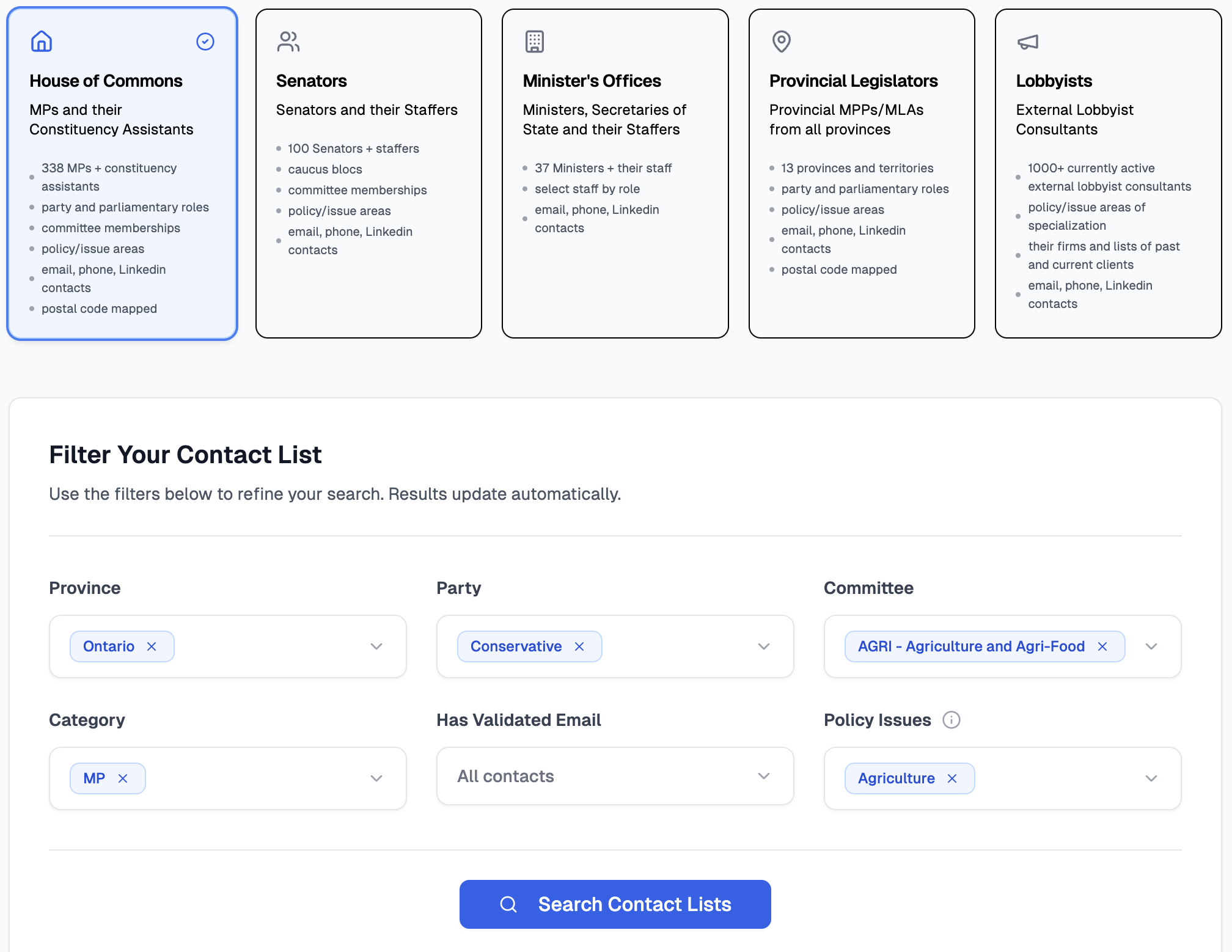 On the site, you can filter contact lists by role, province, committee (for MPs and Senators), and policy issue to identify the right people for the right file.